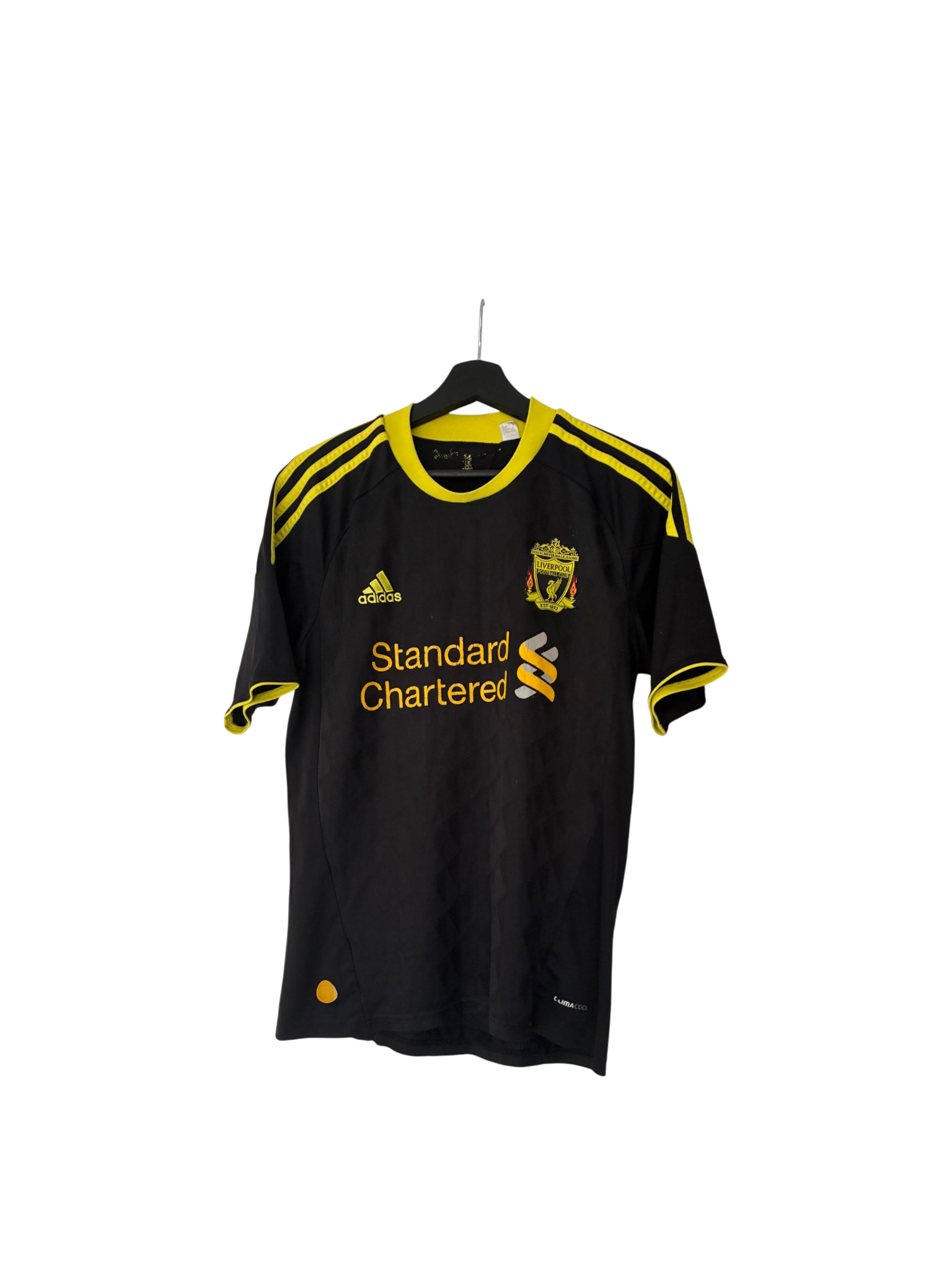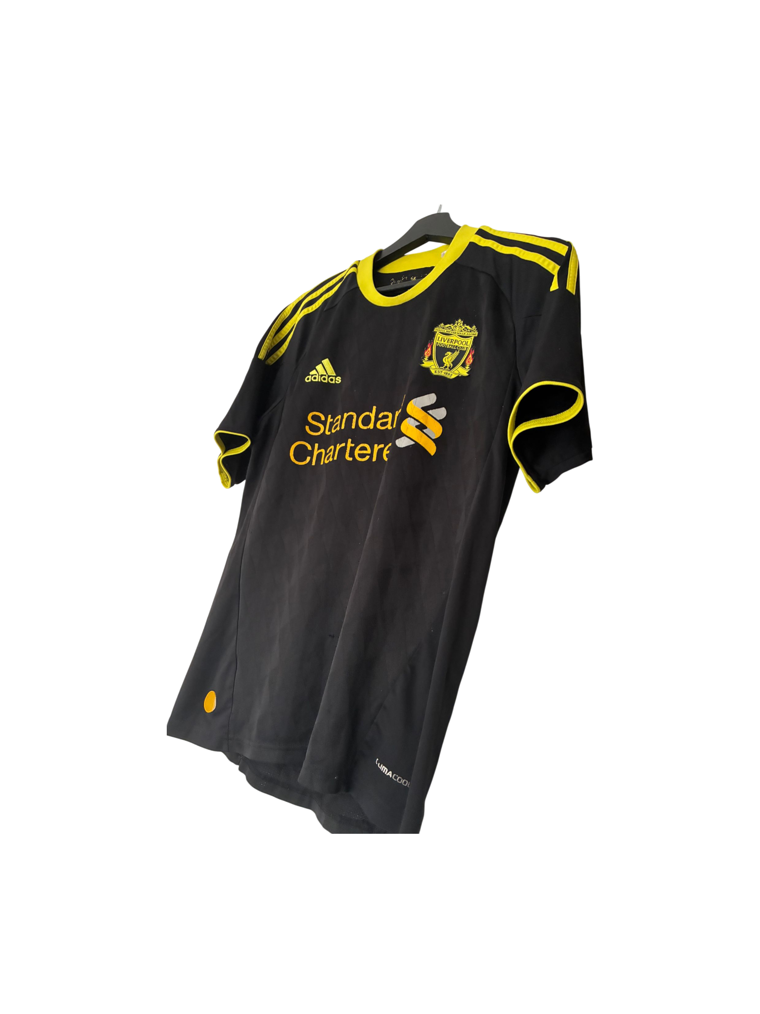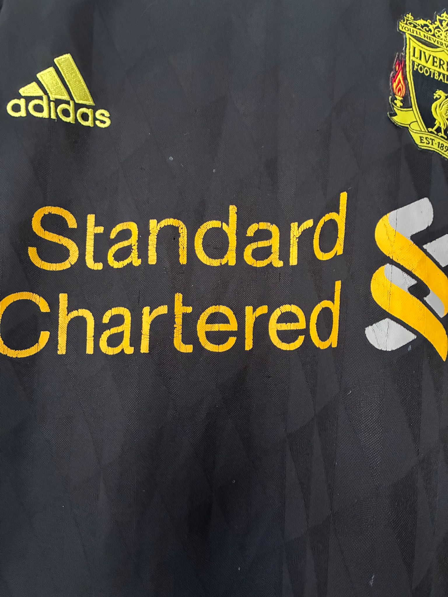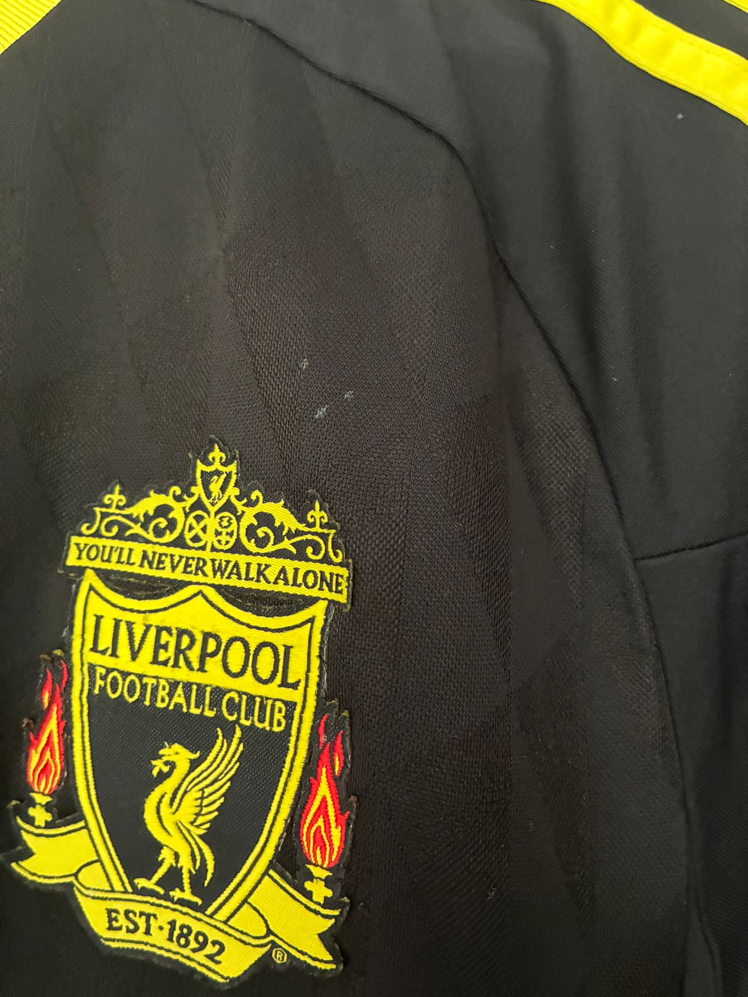 15 år gammel udetrøje fra Pool. Båret af Gerrard, Carragher og Agger.